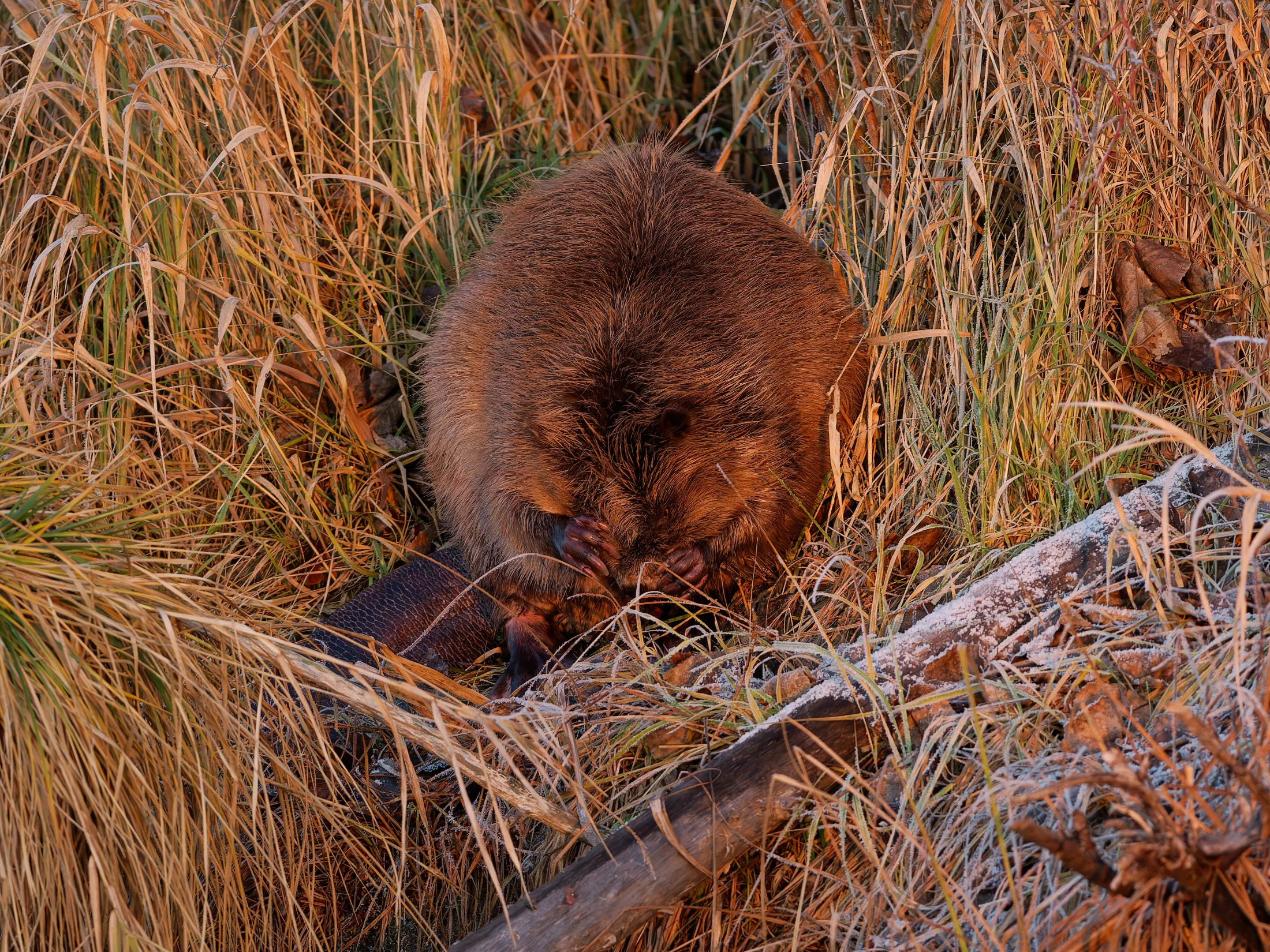 Ich brauchte gar nicht weit zu gehen, da begrüßte mich ein Graureiher, der sich in der Sonne badete. Ich verweilte ein paar Minuten und ging weiter, was dem Graureiher nicht behagte. Er stieg auf und verschwand mit einem lauten Krächzen in den Wiesen. Als ich die Brücke hinter mir ließ, sah ich auf der gegenüberliegenden Böschung einen stattlichen Biber sitzen, der sich ausgiebiger Fellpflege hingab.