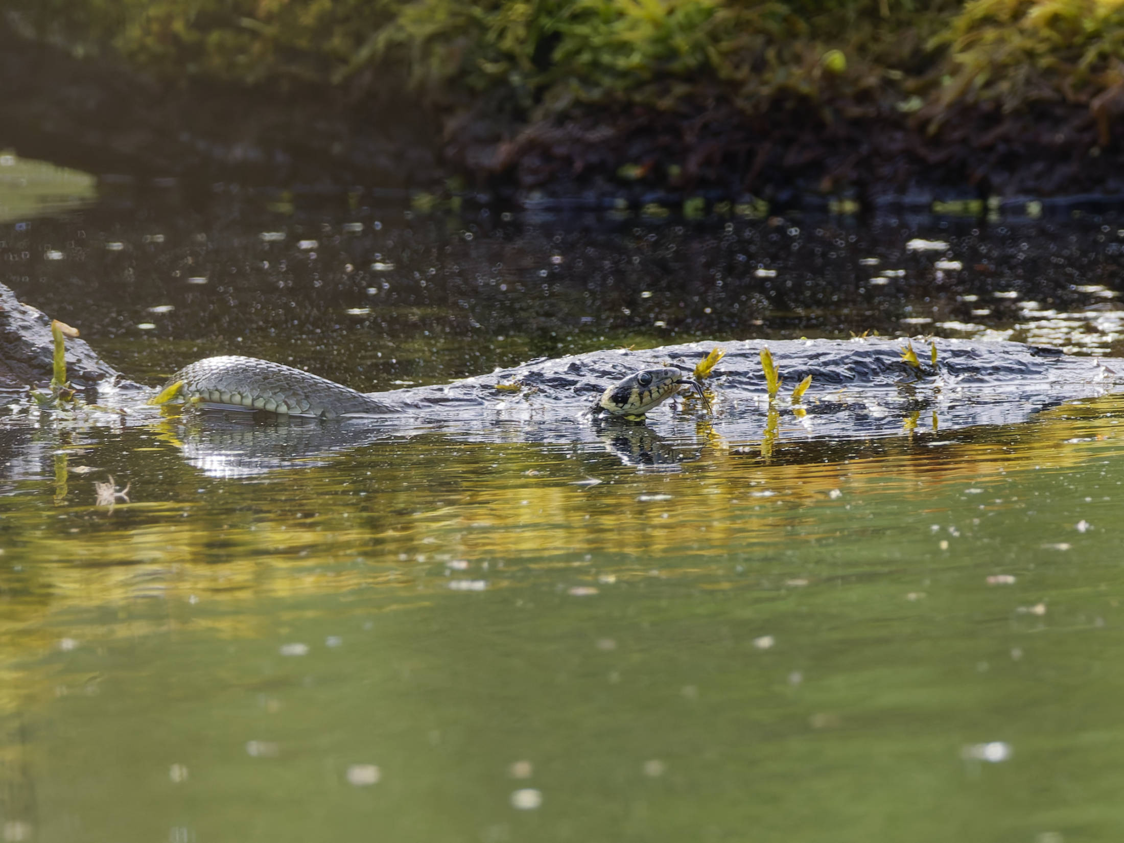 Nahe der Uferböschung lag ein großer Ast im Wasser, hinter dem die Ringelnatter kurz verweilte; lediglich ihr Kopf war zu sehen. Die Sonne hob ihr unverkennbares gelblich-schwarzes Nackenband hervor. Nach einem kurzen Moment der Ruhe überquerte sie den Ast. Während sie im seichten Wasser mit gehobenem Kopf und züngelnder Zunge schwamm, befand sich der hintere Teil ihres Körpers noch auf dem Ast. Das sanfte Licht der Sonne betonte die Schönheit dieser Szene, in der die Ringelnatter im Wasser spiegelnd mit eleganter Bewegung ihre Jagd fortsetzte.
