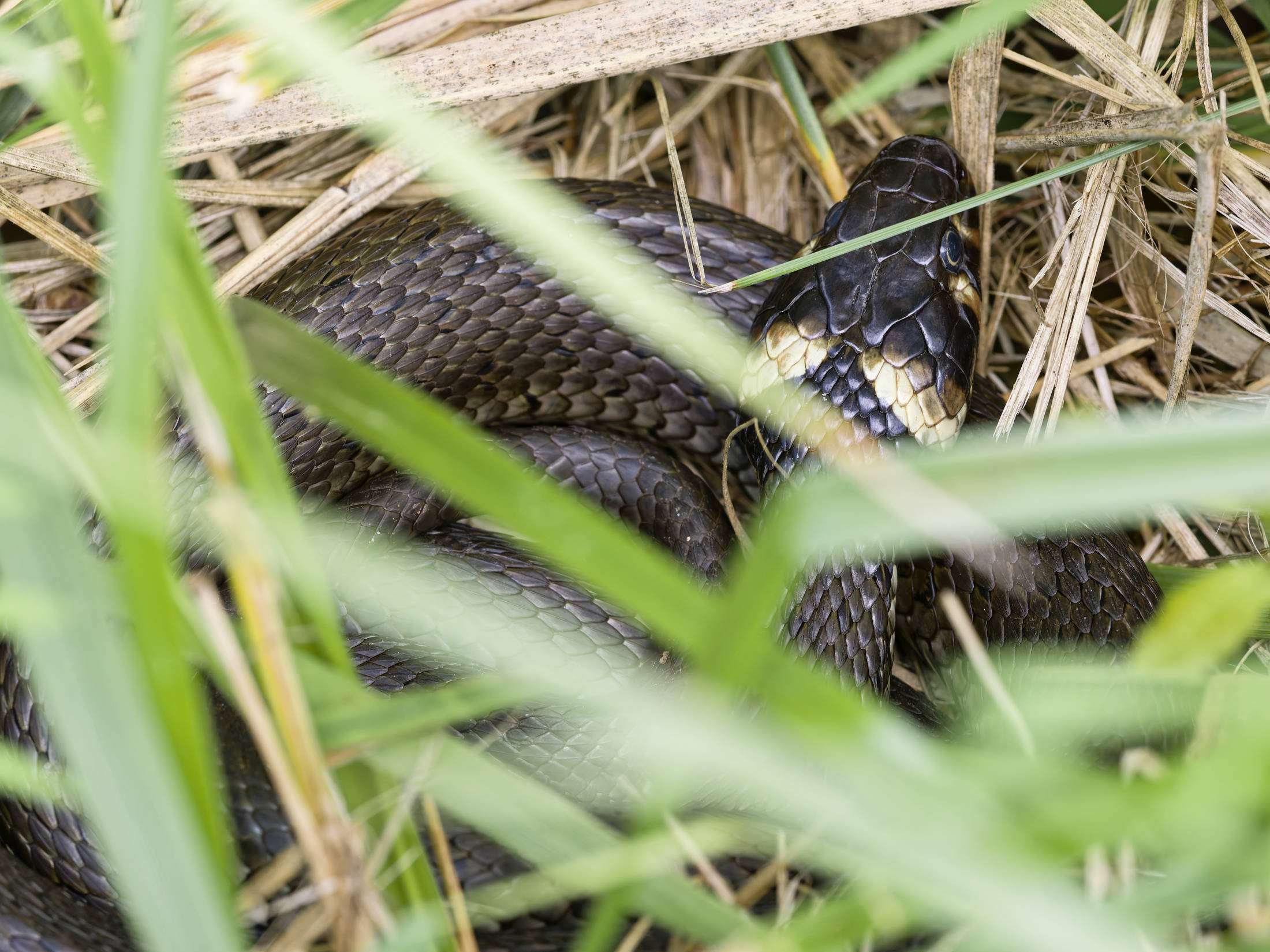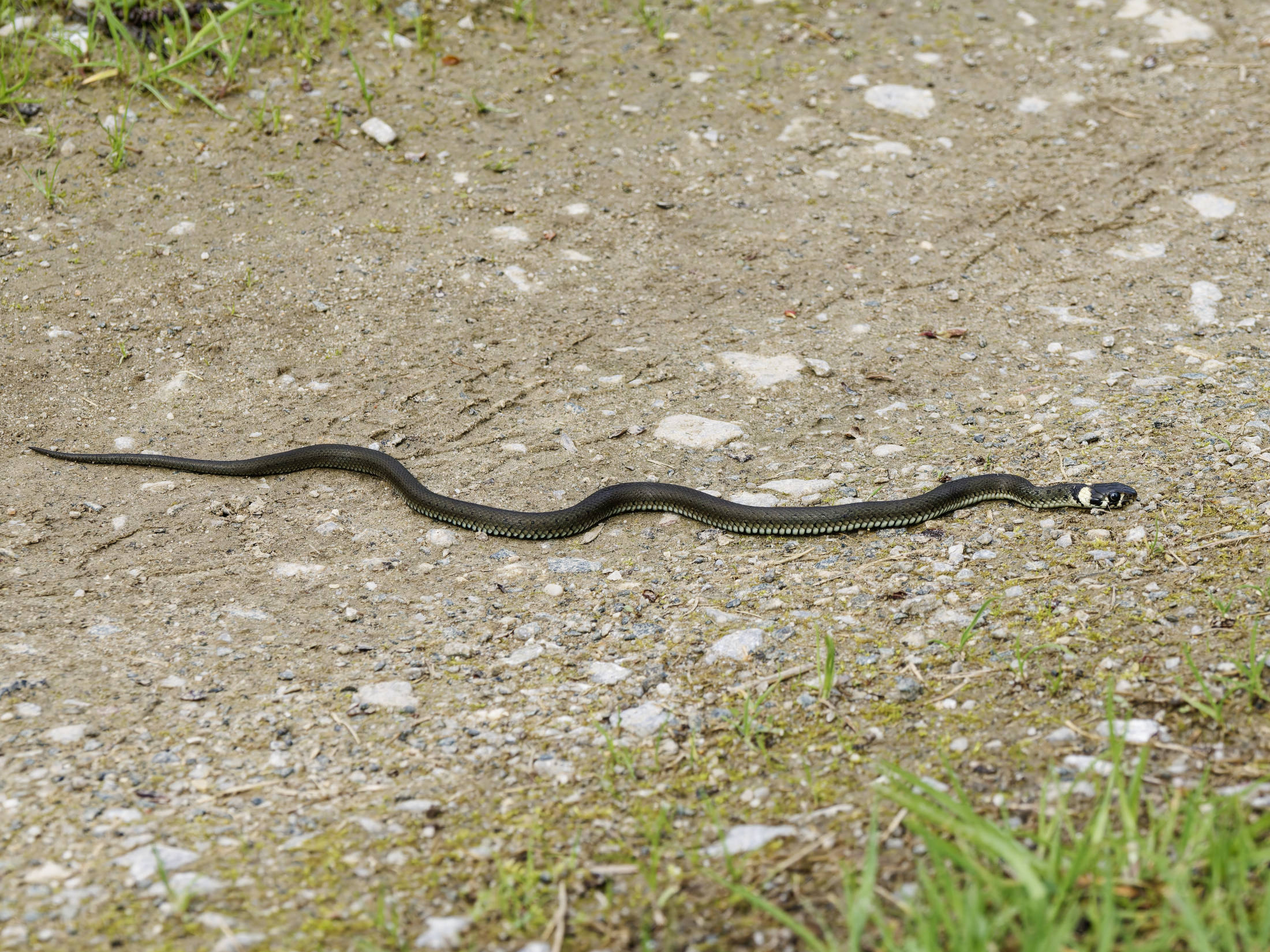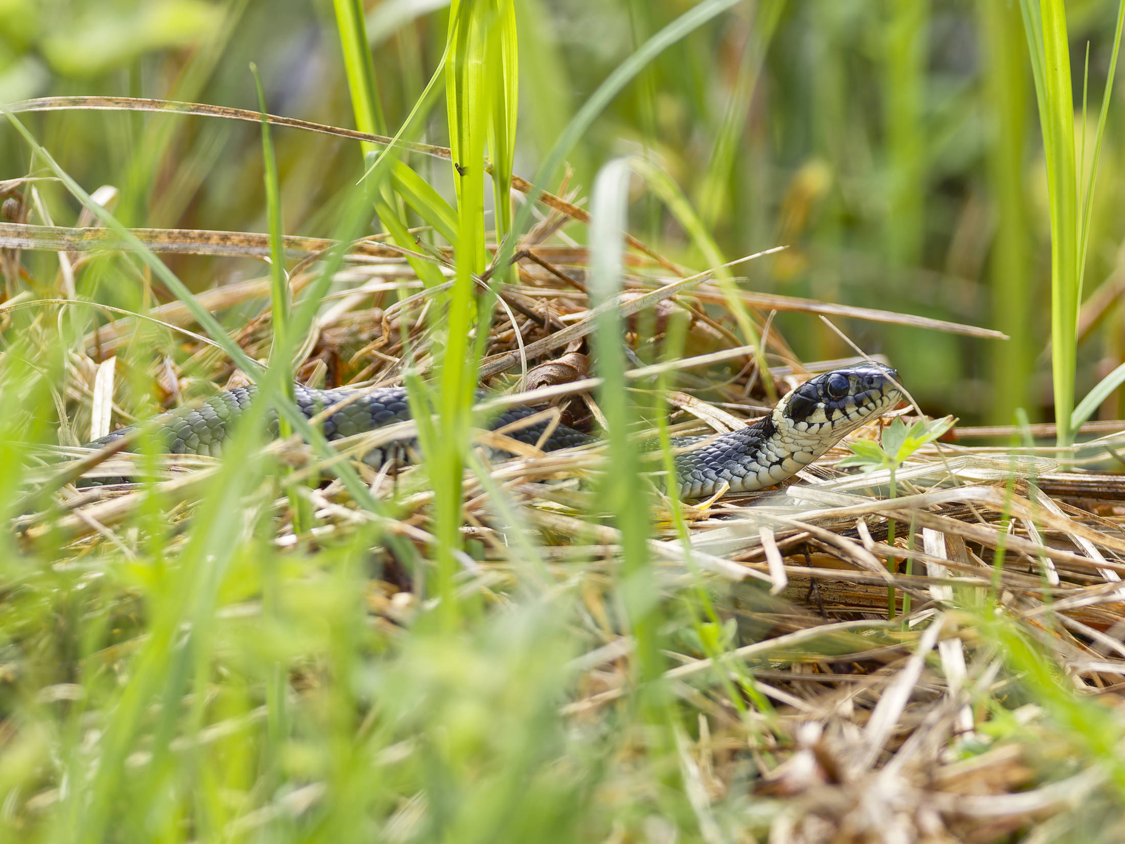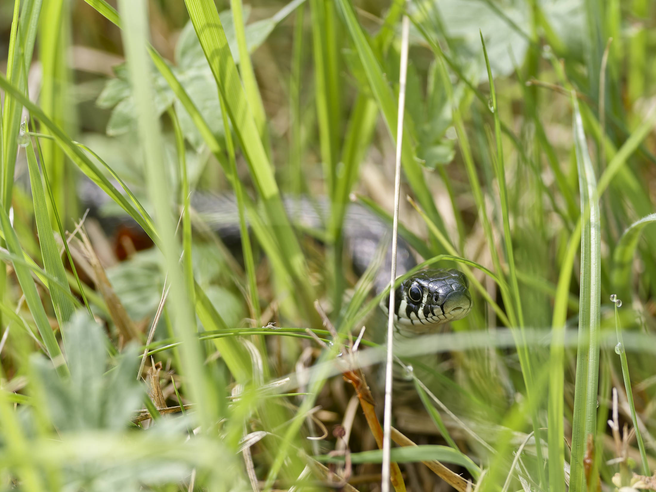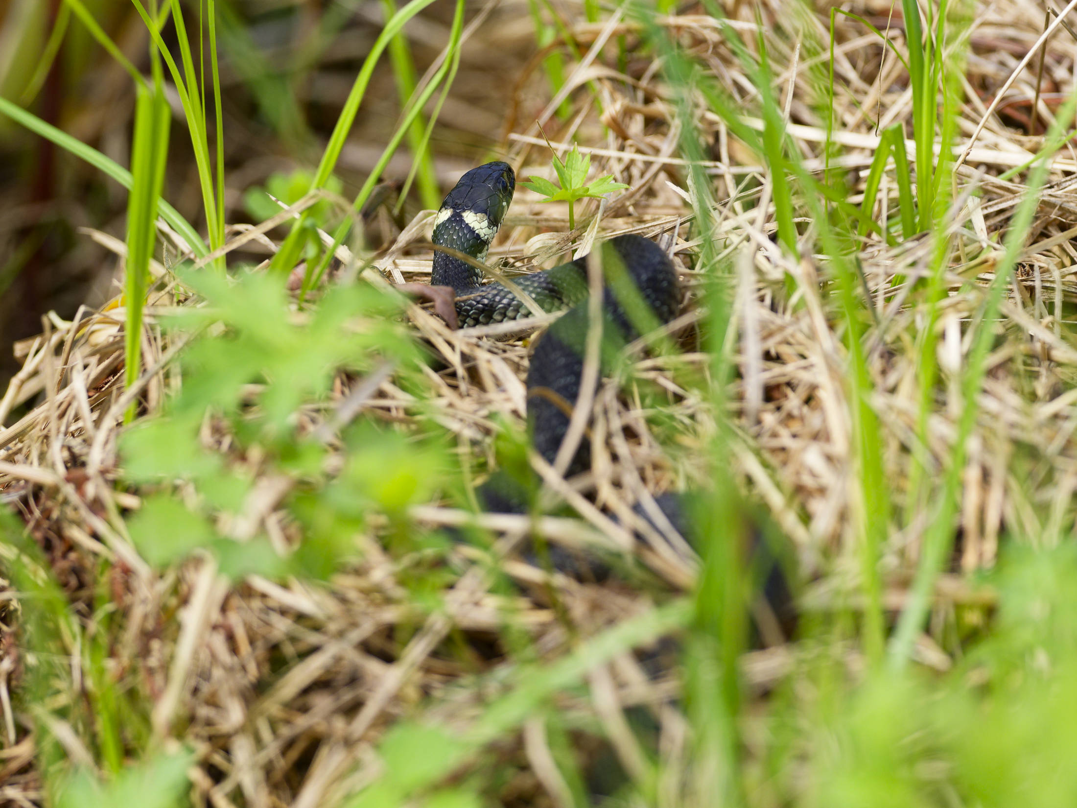 An diesem Morgen konnte ich eine große Ringelnatter ausfindig machen, die eingerollt im Gras lag und sich wärmte. Auf der anderen Seite des Weges schlich eine Ringelnatter durch das Grün der Uferböschung.