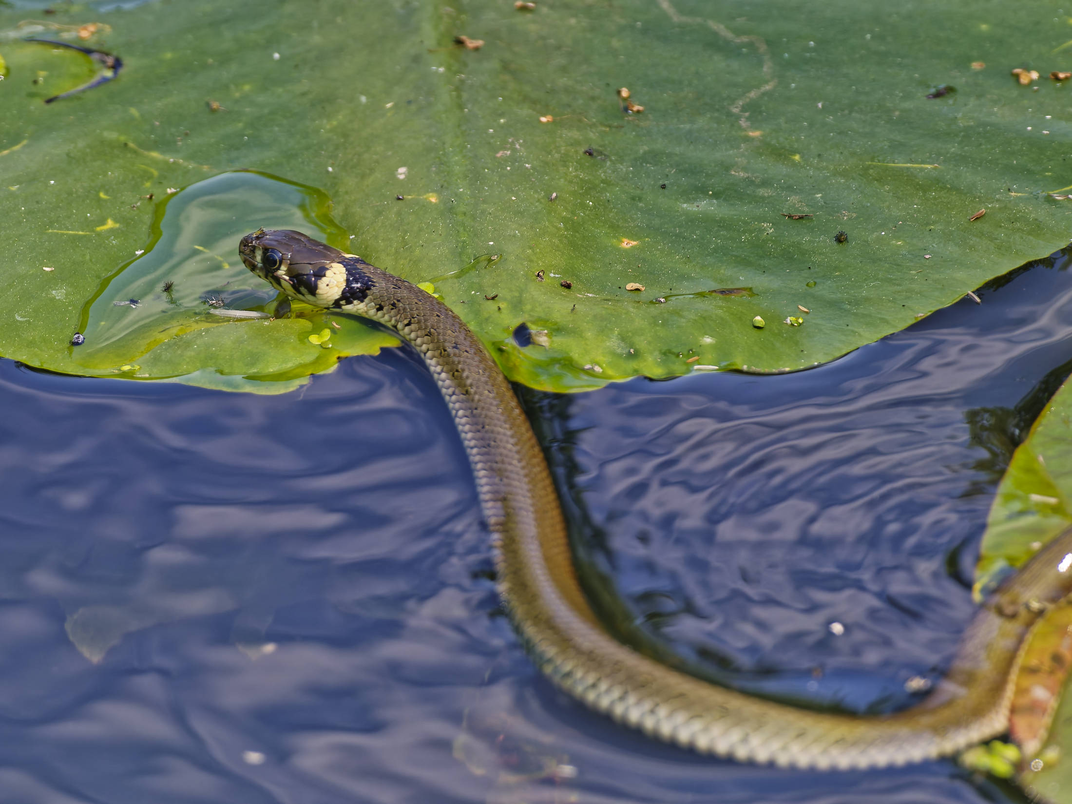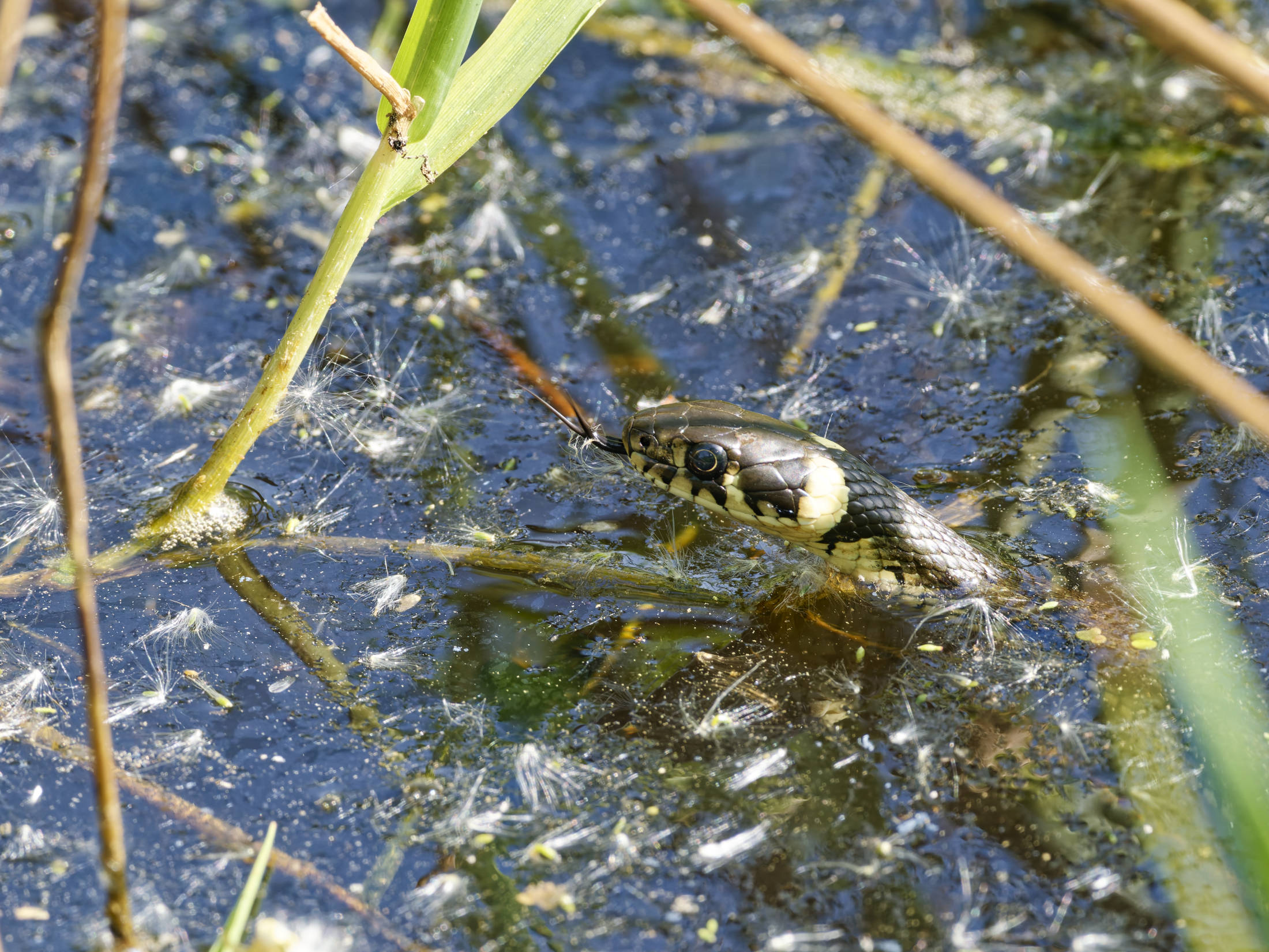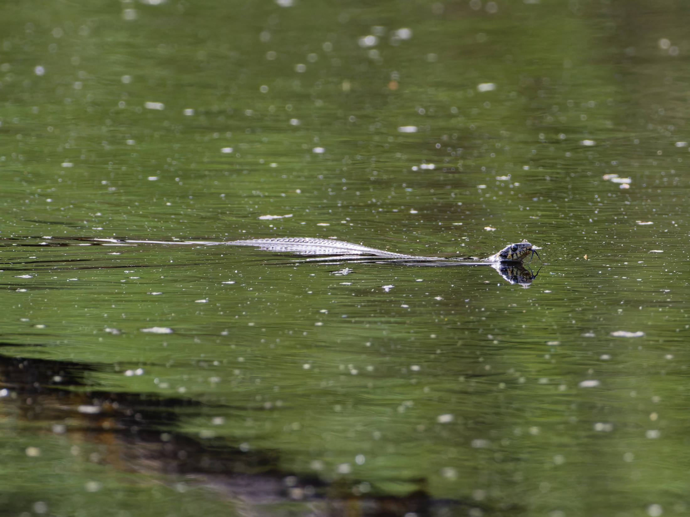 Nahe der Uferböschung lag ein großer Ast im Wasser, hinter dem die Ringelnatter kurz verweilte; lediglich ihr Kopf war zu sehen. Die Sonne hob ihr unverkennbares gelblich-schwarzes Nackenband hervor. Nach einem kurzen Moment der Ruhe überquerte sie den Ast. Während sie im seichten Wasser mit gehobenem Kopf und züngelnder Zunge schwamm, befand sich der hintere Teil ihres Körpers noch auf dem Ast. Das sanfte Licht der Sonne betonte die Schönheit dieser Szene, in der die Ringelnatter im Wasser spiegelnd mit eleganter Bewegung ihre Jagd fortsetzte.