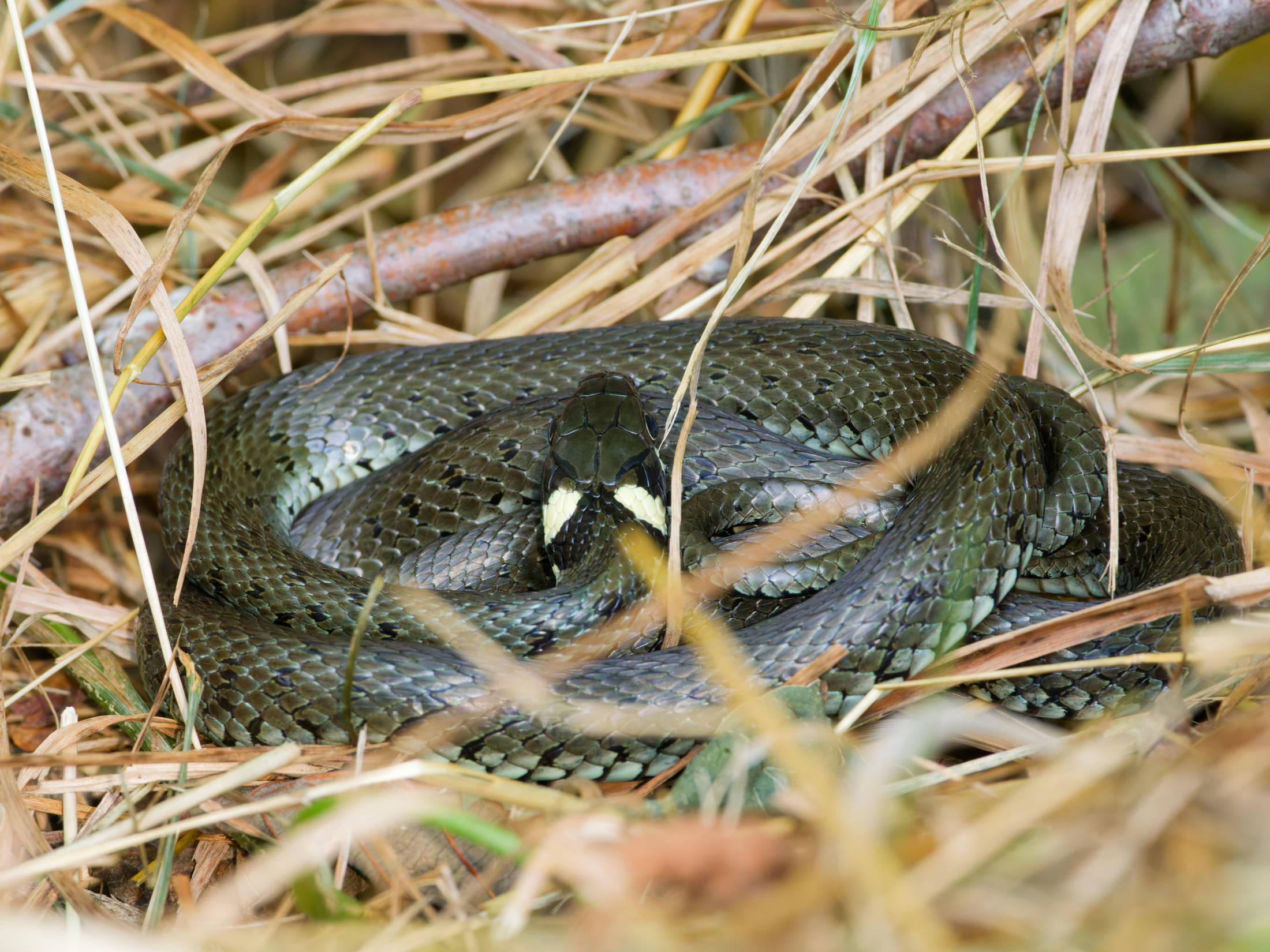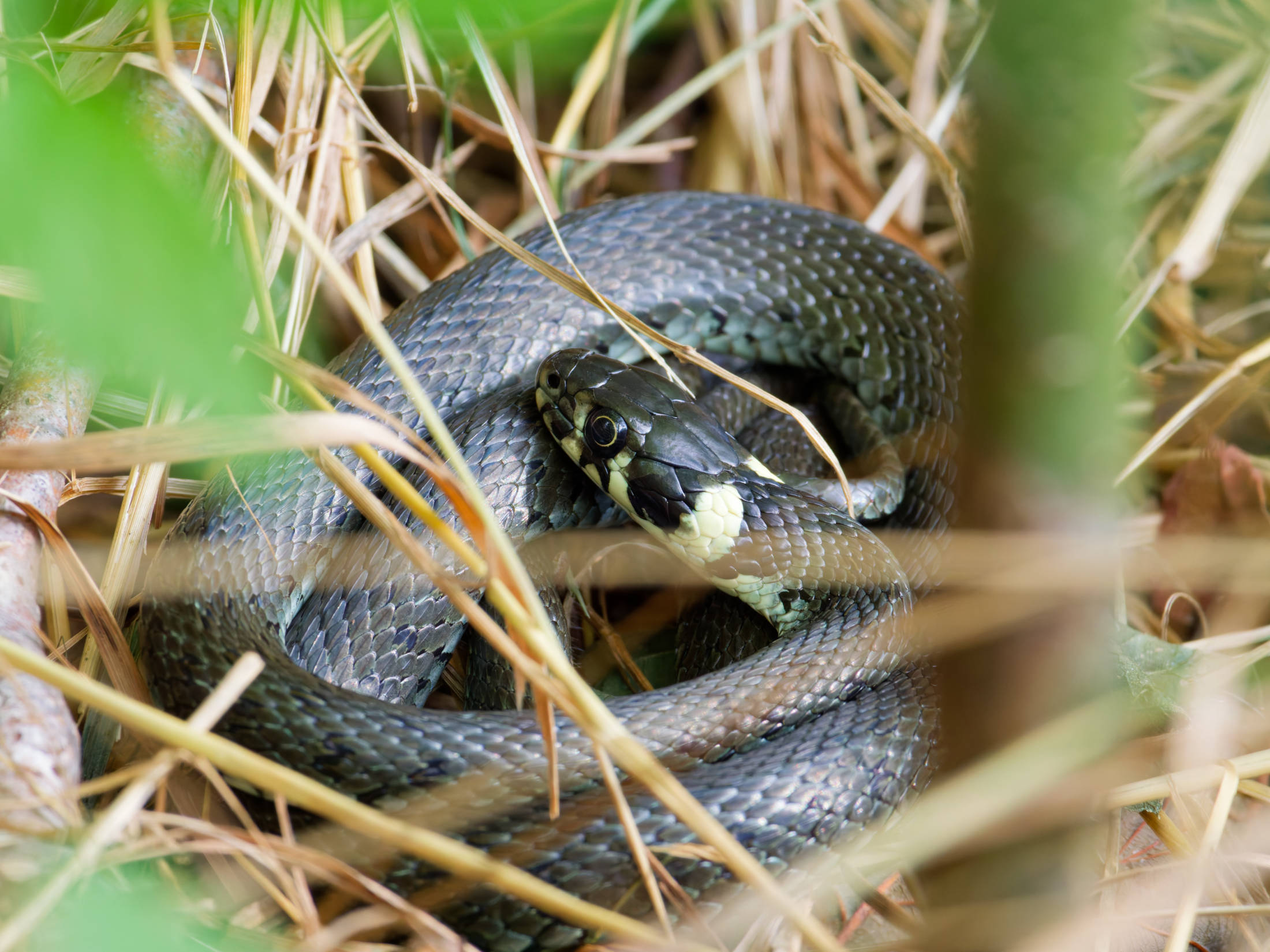 An diesem Morgen konnte ich eine große Ringelnatter ausfindig machen, die eingerollt im Gras lag und sich wärmte. Auf der anderen Seite des Weges schlich eine Ringelnatter durch das Grün der Uferböschung.